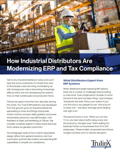 In this article, Tribute explores how modern industrial ERP systems — like our TrulinX ERP — help distributors streamline operations, improve gross margins, and simplify tax automation and compliance through integrated solutions from partners such as Avalara.